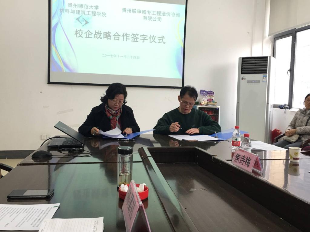 11月24日14:30,贵州联审诚专工程造价咨询有限公司在贵州师范大学花溪校区材料与建筑工程学院三楼会议室举行校企战略合作签字暨捐资助学仪式。贵州联审诚专工程造价咨询有限公司总经理代小林、民建贵阳市委副主委徐朝刚、花溪区人大副主任孙剑、贵州师范大学材料与建筑工程学院党委书记杨庆康、副书记郑环、院长刘卫、党委组织员粟灿辉、学院各学科系主任以及学院受资助的20余名学生共同参加此次捐资助学仪式。仪式由学院党委副书记郑环主持。