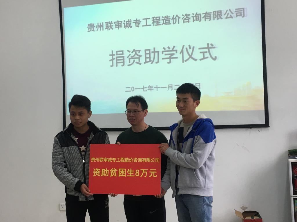 最后,民建贵阳市委副主委徐朝刚在讲话中指出,贵州联审诚专工程造价咨询有限公司在蒸蒸日上之时,不忘感恩回报社会,帮助家庭经济困难的大学生完成自己的学业。同时,希望受资助的学生能珍惜来之不易的学习机会,常怀感恩之心,严格要求自己,注重创新创业,全面发展,不断进取,早日成才。据悉,贵州联审诚专工程造价咨询有限公司今年在材料与建筑工程学院共捐赠贫困助学金八万元、“三创”励志金两万元。