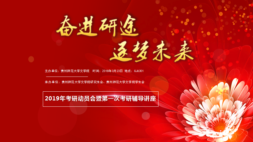 文学院秉承“慎思笃行,博学致新”的校园精神,以传承民族文化,培养栋梁之才为己任,励精图治,孜孜以求。为帮助学生坚定理想,树立正确的人生航向,早日了解考研和就业趋势,激发本科阶段同学考研热情,树立考研信心。3月23日下午,文学院团委在花溪校区GJ6301成功举行2019年考研动员会暨第一次考研辅导讲座。文学院党委书记刘海、院长易闻晓、党委副书记林也婷、副院长管新福出席动员会,办公室冯加峰老师,辅导员杨昌鑫、方锐、李国珍以及2015级全体学生、16、17级学生代表、文学院研究生会、学生会干部代表等300余人参加。动员会由分管文学院研究生工作的管新福副院长主持,考研辅导讲座主讲为文学院研究生科周思辉老师。