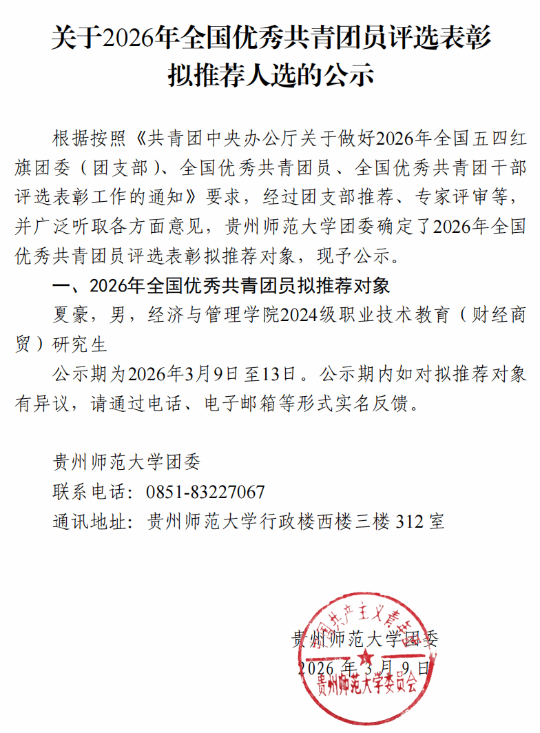 关于2026年全国优秀共青团员评选表彰拟推荐人选的公示